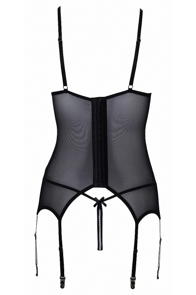 Le corps de la guêpière en fine résille et dentelle extensibles, possède une fermeture à agrafes dans le dos réglable sur deux positions. Quatre bretelles réglables permettent de fixer vos bas (non fournis). Les seins nus sont soulignés par des rangées de perles qui cerclent les seins joliment mis en valeur.